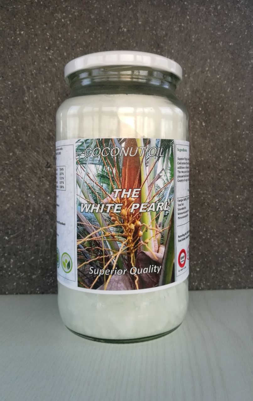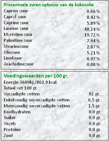 Superior Virgin kokosolie. Gedroogd en koud geperst van verse kokosnoten, 100% zuiver zonder toevoegingen en chemicaliën. Het gehele proces geberut en onder de 40 °C